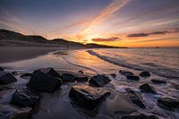 Een kleurrijke zonsopkomst op een frisse morgen aan het strand van Zoutelande, met de kenmerkende duinenpartij op de achtergrond.