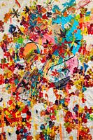 Er is gebruik gemaakt van een structuurpasta met een grove korrel. Waardoor het nacht het zachte uiterlijk, ook ruw en robuust oogt. Wat verschuilt zich achter alle vrolijk gekleurde bloem? Wat schuilt er achter?