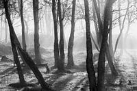 Op een mistige ochtend reed ik naar Lentevreugd in Wassenaar (Nederland). Toen de zon door de mist heen scheen, ontstond dit boeiende beeld. Door de omzetting naar zwart wit werd deze foto nog wat dramatischer.
