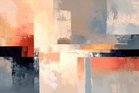 Een abstracte compositie met een mix van zachte pasteltinten en donkere tinten. Het kunstwerk toont een reeks geometrische vormen waardoor een gelaagd effect ontstaat in een minimalistische stijl.