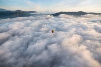 A hot air balloon flies over a sea of clouds during beautiful sunrise.