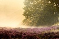 Een zeer intensief beeld tijdens een mistige ochtend in de Posbank in het Veluwezoom National Park. Helder zonlicht dat spectaculaire lichtstralen door de boom geeft. De paarse voorgrond die wordt gegeven door een volledig bloeiende heide.