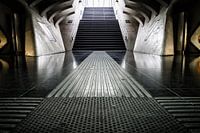 De trappen onder het nieuwe station van Luik Guillemins in België. Door het materiaal gebruik en het kunstlicht krijgt het gebied onder het station een haast onaardse uitstraling, in tegenstelling tot het bovengrondse deel dat overwegend wit is. Een mooi station met een mooi contrast.