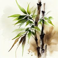 Het werk laat een aquarel zien met twee bamboestammen. De aardetinten zorgen voor een neutrale plaat met een rustige sfeer. Passend voor een gezellige woonkamer.