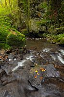 Een mooi riviertje in de Vulkaan-Eifel bij het plaatstje Strohn. Het gebied heet de Strohner Schweiz, hier is vroeger veel vulkaan activiteit geweest. Door de grote en ruige rotsen lijkt het een beetje op Zwitserland. Prachtige groene rotsen met herfst blaadjes op een rots in de voorgrond. De zon schijnt mooi in het bos achter in de foto.