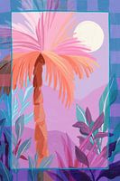 Vrolijke geschilderde illustratie van een kleurrijk landschap met een palmboom en andere mooie planten. Je krijgt meteen zin in warme zomeravonden in een tropische omgeving. Het kleurenpalet is een combinatie van warme en koele kleuren.