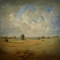 HET SCHILDERIJ TOONT EEN OPEN LANDSCHAP MET WOLKEN MAAR EEN STREEPJE BLAUWE LUCHT. HET STRAALT EEN RUSTIEKE SCHOONHEID UIT. DE NATUUR IS IN DIT SCHILDERIJ EEN VERZAMELING VAN AARDE EN LUCHT