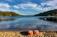 Dit is een rustgevend uitzicht over de mooie Åptafjord in zuid Noorwegen. We zien het fjordlandschap in de avondzon, in het gouden uur met twee gekleurde kano's op de voorgrond.
