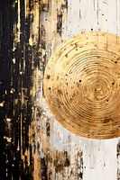 Dit fascinerende abstracte kunstwerk combineert geometrische precisie met expressieve textuur. Elegante gouden accenten, gecombineerd met diep zwart en stralend wit, creëren een harmonieuze maar dynamische compositie. De cirkelvormige elementen symboliseren beweging en energie, terwijl de rechthoekige structuren in contrast staan voor…