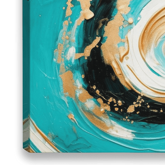 Moderne kunst met goudkleurige vormen, gedempte contrasten en een turquoise textuur. Dit abstracte schilderij in panoramisch formaat straalt een tijdloze dynamiek uit. De kleuren smelten samen tot een harmonieuze compositie.