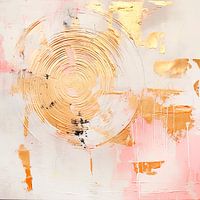 Moderne kunst met goudkleurige vormen, sterke contrasten en een textuur in lichtroze. Dit abstracte schilderij straalt een tijdloze, frisse energie uit. De kleuren smelten samen tot een harmonieuze compositie.