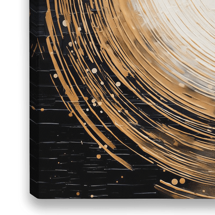 Dit indrukwekkende abstracte kunstwerk betovert de kijker met een krachtige spiraalbeweging die diepte en dynamiek uitstraalt. De harmonieuze combinatie van goud, zwart en wit creëert een luxueuze maar energieke uitstraling. De sterke textuur van de kleurentoepassing geeft het werk een boeiend gevoel waardoor het bijna levend lijkt. De…