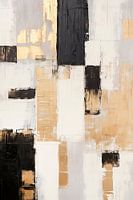 Dit indrukwekkende abstracte kunstwerk combineert moderne elegantie met een harmonieuze balans van zwart, wit en luxueus goud. De verticale en rechthoekige vormen creëren een architectonisch gevoel dat zowel structuur als artistieke vrijheid weerspiegelt. Het gebruik van dikke kleurtoepassingen en spannende texturen creëert een…