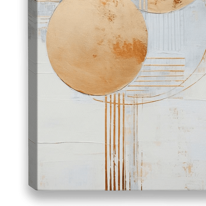 Moderne kunst met gouden geometrische vormen, waaronder cirkels en lijnen, steken af tegen een gedempte, abstracte achtergrond. Het ontwerp heeft een minimalistische esthetiek met een mix van metallic glans en zachte neutrale tinten. Dit abstracte schilderij straalt een tijdloze, contemplatieve rust uit. De kleuren smelten samen tot een…