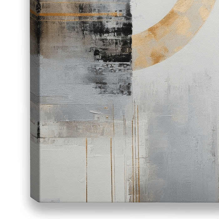 Moderne kunst met goudkleurige vormen, gedempte contrasten en een textuur in lichtgrijze tinten. Dit abstracte schilderij straalt een tijdloze, contemplatieve rust uit. De kleuren smelten samen tot een harmonieuze compositie. Kracht schuilt in rust.