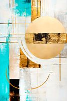 Moderne kunst met goudkleurige vormen, sterke contrasten en een textuur in zwart-wit en turquoise. Dit abstracte schilderij straalt een tijdloze, frisse energie uit. De kleuren smelten samen tot een harmonieuze compositie.