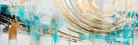 Moderne kunst met goudkleurige vormen, gedempte contrasten en een turquoise textuur. Dit abstracte schilderij in panoramisch formaat straalt een tijdloze, contemplatieve rust uit. De kleuren smelten samen tot een harmonieuze compositie.