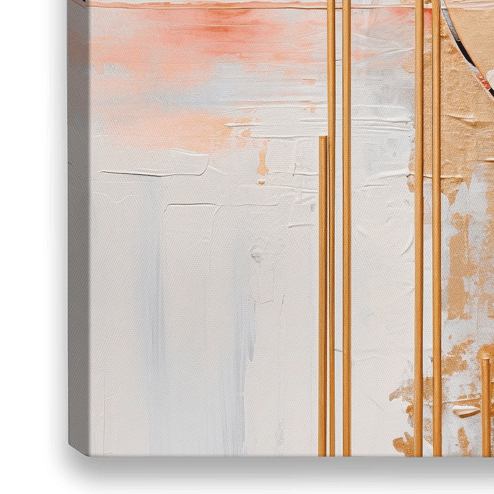 Moderne kunst die accenten legt met luxe details en harmonie en verfijning uitstraalt. Dit abstracte schilderij straalt een heldere, minimalistische elegantie uit die indruk maakt door de combinatie van zachtroze tinten, zuiver wit en gouden cirkelstructuren. De delicate maar kernachtige lijnen van de gouden elementen lijken in…