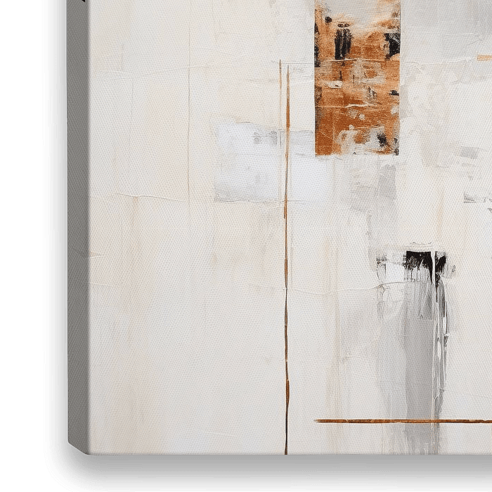 Moderne kunst met gouden geometrische vormen. Het ontwerp heeft een minimalistische esthetiek met een mix van metallic glans en zachte neutrale tinten. Dit abstracte schilderij straalt een tijdloze, contemplatieve rust uit. De kleuren smelten samen tot een harmonieuze compositie. Er schuilt kracht in rust.