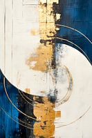 Moderne kunst met goudkleurige vormen, sterke contrasten en een textuur in donkerblauw en wit. Dit abstracte schilderij straalt een tijdloze energie uit. De kleuren smelten samen tot een harmonieuze compositie.