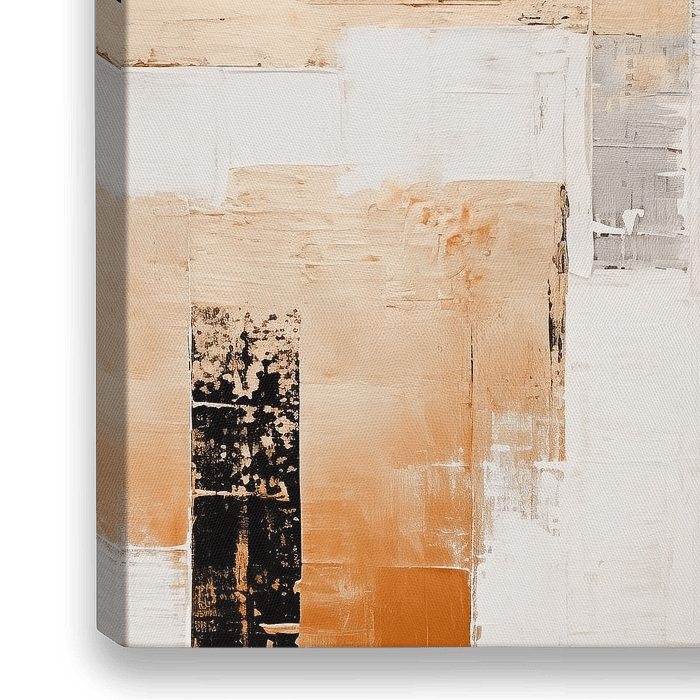 Moderne kunst met gouden geometrische vormen. Het ontwerp heeft een minimalistische esthetiek met een mix van metallic glans en zachte neutrale tinten. Dit abstracte schilderij straalt een tijdloze, contemplatieve rust uit. De kleuren smelten samen tot een harmonieuze compositie. Er schuilt kracht in rust.