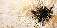 Moderne kunst met goudkleurige vormen, sterke contrasten en een textuur in zwart en wit. Dit abstracte schilderij in panoramisch formaat straalt een tijdloze energie uit. De kleuren smelten samen tot een harmonieuze compositie.