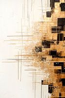 Moderne kunst met goudkleurige vormen, sterke contrasten en een textuur in zwart en wit. Dit abstracte schilderij straalt een tijdloze energie uit. De kleuren smelten samen tot een harmonieuze compositie.