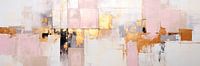 Moderne kunst in een panoramisch formaat dat accenten legt met luxe details en harmonie en verfijning uitstraalt. Dit schilderij combineert abstracte vormen met luxe accenten om een harmonieuze maar dynamische sfeer te creëren. De zachte roze tinten en subtiele witte vlakken creëren een kalme, aardende achtergrond, terwijl de metallic gouden details glamour en warmte toevoegen. De structuur en rangschikking van de oppervlakken creëren een gevoel van evenwicht dat zowel modern als tijdloos is. Zwart en grijs zorgen voor subtiele contrasten die diepte en complexiteit toevoegen.
