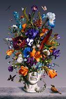In alle stilte herinner ik me je gezicht. Met klassieke trekken en serene uitdrukking is degene van wie ik hield in steen veranderd. In deze verlatenheid barst het leven los in een levendige weergave - bloemen van verschillende soorten en kleuren verstrengelen zich in een weelderige, chaotische harmonie. Vogels, vlinders en andere insecten voegen een dynamisch, etherisch gevoel toe, in contrast met de stilheid van het standbeeld. De levendige oranje, paarse en blauwe bloemen creëren een betoverend tapijt, zorgvuldig vervaardigd om beweging en groei uit te drukken. Het leven kan bloeien uit een enkele traan.