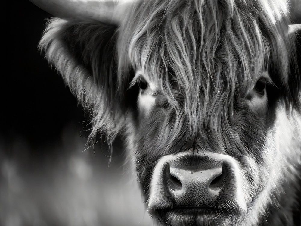 Dit verbluffende digitale kunstwerk, gecreëerd met behulp van geavanceerde AI-technologieën in november 2023, biedt een meeslepende close-up van een Schotse hooglander. In deze zwart-wit afbeelding komt de kracht en gratie van dit majestueuze dier op een unieke en indringende manier tot uiting.