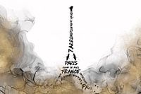 Alcohol inkt met gouden accenten creëren een decoratief abstract werk. De lichtheid van het inktpatroon vloeit rond het Eiffeltorenontwerp. Kunstig werk met typografische elementen.