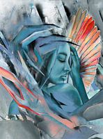 Alien is een schilderij van een vrouw in een blauwe kleur. Ik heb hier veel technieken gebruikt en het was erg leuk om deze te maken. Ik heb ducktape met spuitbussen gebruikt om de achtergrond te maken:) Je kunt ook een mooie vleugel achter haar zien. Ik hoop dat je ervan geniet.
