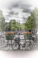 Amsterdam staat bekend als het Venetië van het Noorden. Vele idyllische grachten lopen door het historische centrum. De Herengracht (Herrengraben) is het binnenste van de drie behoren tot de grachtengordel kanalen. Een typische uitzicht vanaf Amsterdam met fietsen op een brug. Stralen van de zon verlicht de scène.