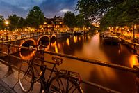 De grachten in Amsterdam, kenmerkend voor de historische aanblik van de stad en zijn van grote culturele en historische waarde. De brouwersgracht is een onderdeel van de grachtengordel en markeert de Noordelijke grens van het deel van de stad, de Jordaan. Een idyllisch uitzicht op de zonsondergang op de Brouwer hoek van de gracht Keizersgracht met verlichte brug.