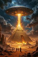 Aan de nachtelijke hemel opent zich een poort van vuur en licht terwijl een kolossale UFO boven een gouden piramide zweeft. Een vurige energiebundel verbindt hemel en aarde, terwijl oude figuren versteend staan in het zand van de woestijn – getuigen van een ontmoeting voorbij tijd en ruimte.