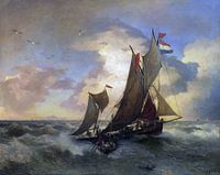 Een Nederlands schip, een zeilschip met vlag uit Nederland worstelt in het ruige water tegen de golven. Bij de boot een roeiboot met matrozen. boven dit schouwspel meeuwen die zeilen op de sterke wind, de storm met daarachter licht dat speelt met de hemel in blauw en wolken in wit.