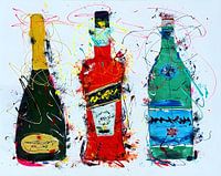 Canvas met acrylverf waarbij de flessen zijn voorzien van een gloss afwerking. De drie flessen vormen de ingrediënten voor een zomerse Aperol Spritz.
