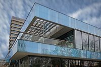 De glasplaten op de gevels van het APG gebouw in Heerlen zorgen voor interessante reflecties van de omgeving.