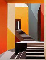 Betreed een wereld waar architectuur en abstractie samenkomen. Dit opvallende kunstwerk betovert met zijn gedurfde geometrische vormen en een meesterlijk samenspel van licht en schaduw. De compositie bestaat uit een reeks oplopende trappen, weergegeven in strakke lijnen en levendige kleurvlakken – vurige oranjetinten, zonovergoten gele…