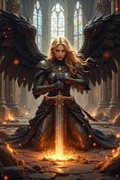 Tussen de ingestorte gewelven van een vervallen kathedraal knielt hij in het stof van eeuwen. De engel rust op één knie, met het zwaard rechtop voor zich, beide handen stevig om het gevest. Zijn zwarte vleugels spreiden zich breed als een schild over het verlaten altaar. Gouden lichtstralen vallen door gebroken ramen en verlichten een…