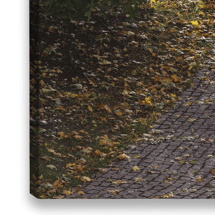 Oktoberbladeren en schaduwen van drie naderende personen op een kasseienpad