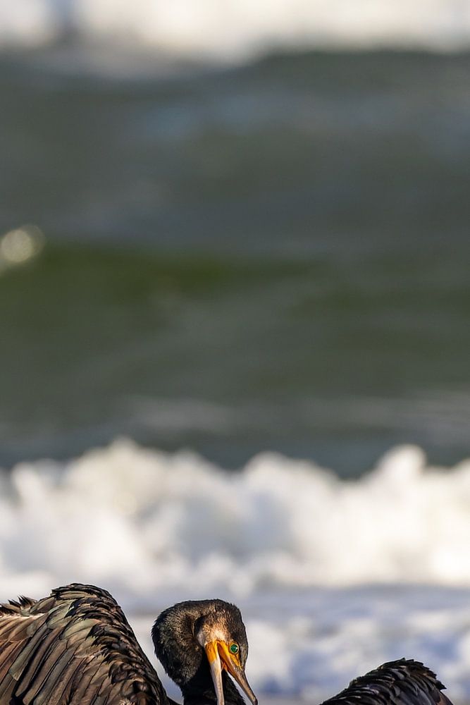 Aalscholver (Phalacrocorax carbo) die zijn vleugels droogt op het strand van Juist, Oost-Friese eilanden, Duitsland.
