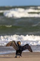 Aalscholver (Phalacrocorax carbo) die zijn vleugels droogt op het strand van Juist, Oost-Friese eilanden, Duitsland.