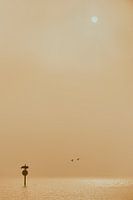 Een aalscholver slaat zijn vleugels uit terwijl die op een bord in het water zit. Twee eenden vliegen voorbij, in de mist bij zonsopkomst. Het zonlicht licht laat het water twinkelen en stralen. De horizon is door de dichte mist boven het water onzichtbaar. De foto is gemaakt aan het Wolderwijd bij Zeewolde in de Flevopolder, Nederland.
