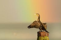 Deze Aalscholver zat mooi te drogen op een meerpaal, achter de Aalscholver stond de regenboog die ik er precies op kon krijgen, dit is in Nederland bij de Brouwersdam in Zeeland.