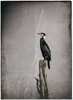 Beeld van aalscholver in grijstinten met reliëf.
