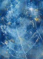 Een natte abstracte cyanotypie van een gedroogd varenblad dat in de winter is geplukt. De cyanotypie is belicht met zonlicht en voor bijkomende effecten zijn zeepsop, kurkumapoeder, zout, azijn en vershoudfolie gebruikt.