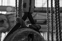 De nostalgische uitstraling van een zeilschip op een zomerse avond. Het schip afgemeerd aan het steiger van de haven. Dit nostalgisch beeld vraagt om zwart wit in de foto. Het karakter van de nerven in de katrol tekenen zo mooi samen met de strengen van de touwen.