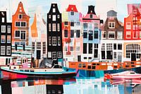 Aan de Amsterdamse grachten, collage van Amsterdam in de zomer. Vrolijke grachtenpandjes aan de gracht en we zien ook een aantal boten. Een echt Nederlands straatbeeld.