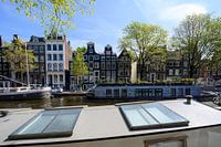 Dit werk toont de paar prachtige huizen aan de Prinsengracht met diverse gevels. Op de voorgrond een van de vele woonboten die Amsterdam rijk is. Aan de bomen met hun lichtgroene bladeren is te zien dat het lente is.